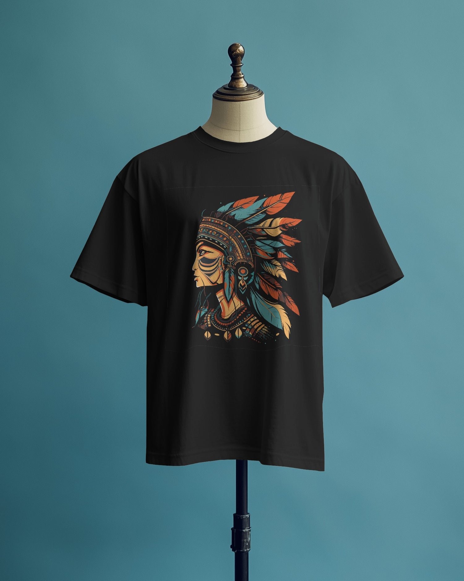 This artistic T-shirt captures the grace and resilience of a Native Indian woman, celebrating her deep connection to nature, culture, and tradition. Featuring an intricate design inspired by Native Indian art, this piece is a tribute to timeless beauty and heritage.